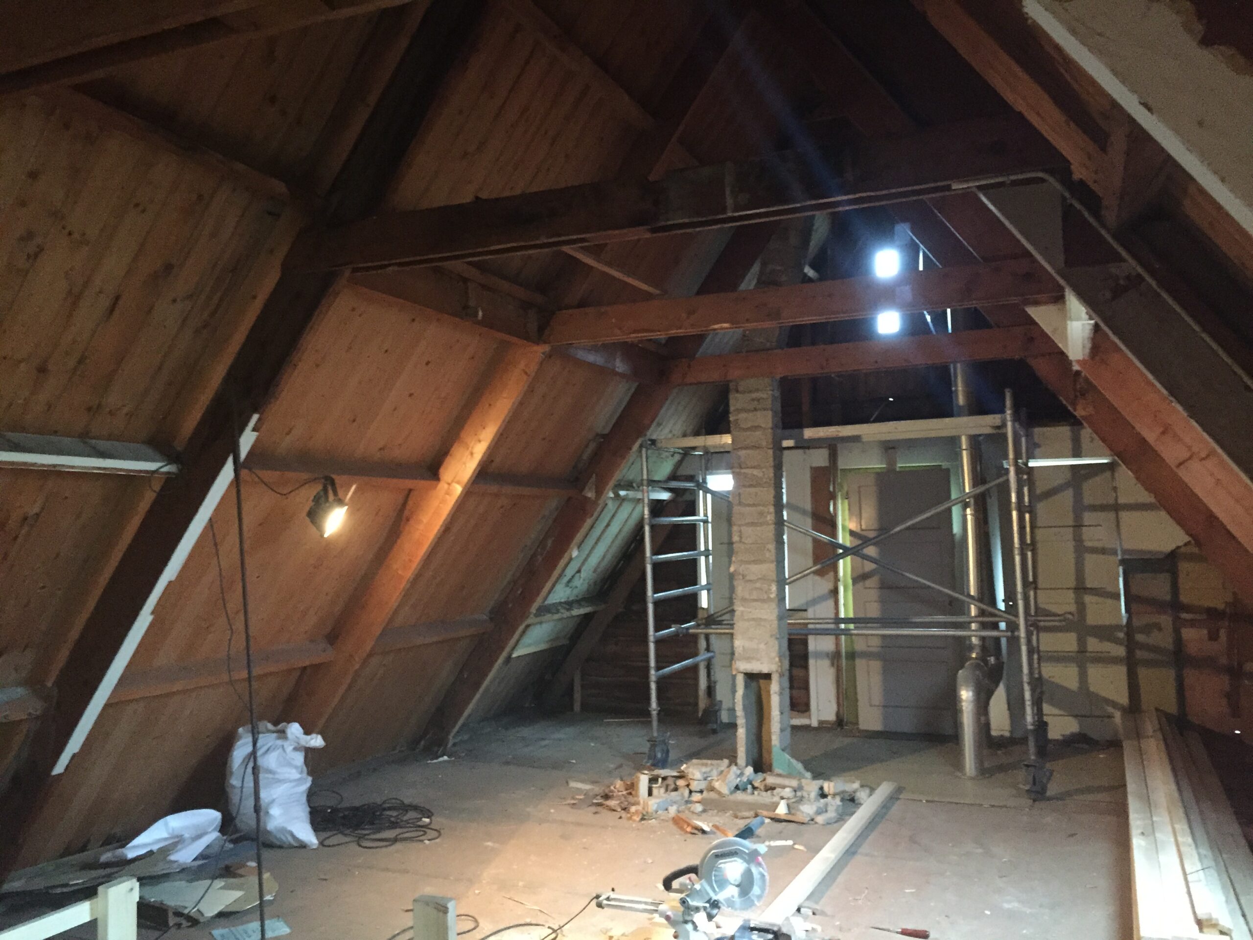 Op de bovenverdieping creëert de eigenaar drie slaapkamers, een badkamer en een vaste opbergkast. Door de vele dakramen die hij plaatst, komt straks overal voldoende daglicht op de verdieping terecht. Naast het huis is nog een stuk verwilderde grond waar een mooie tuin gepland staat.