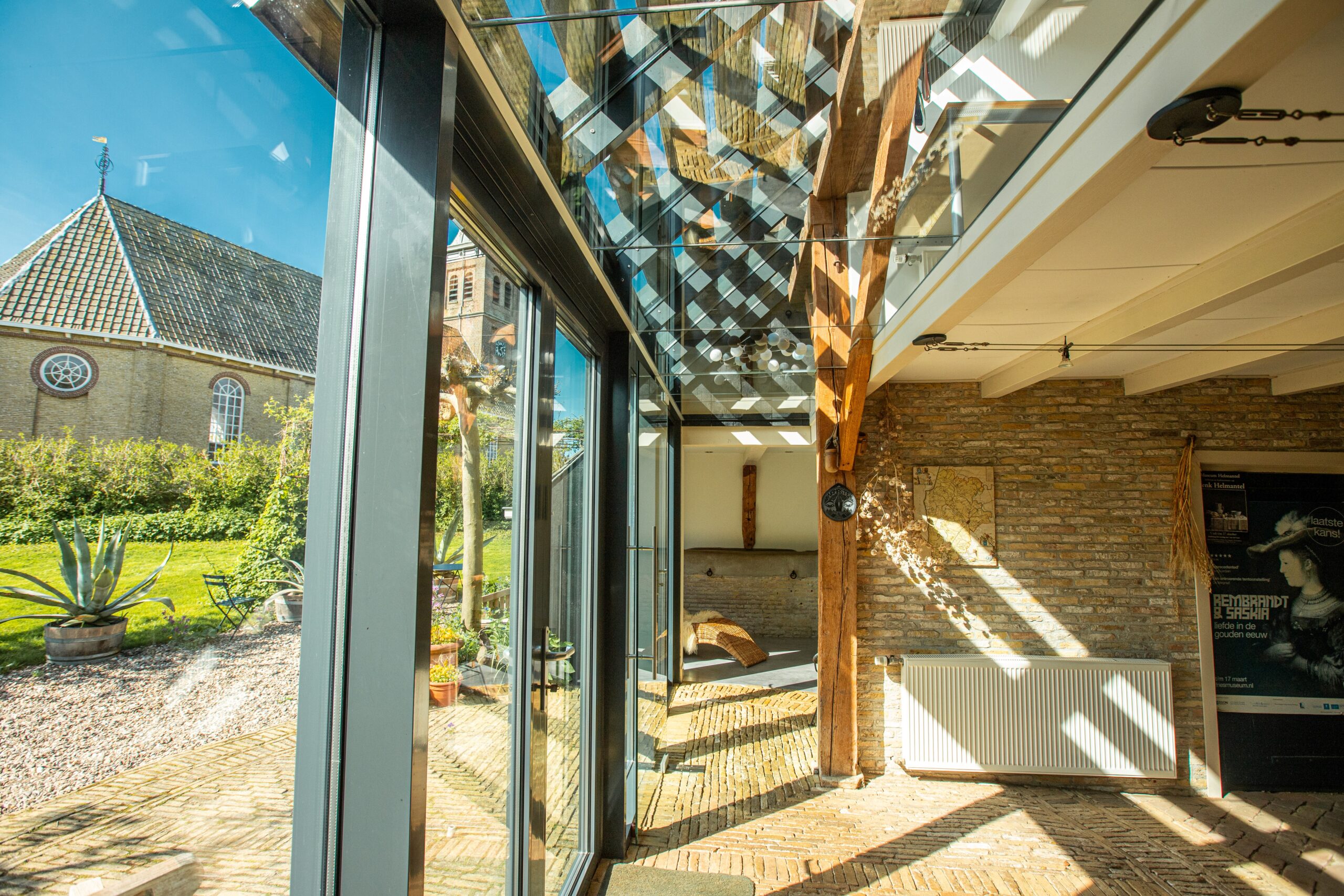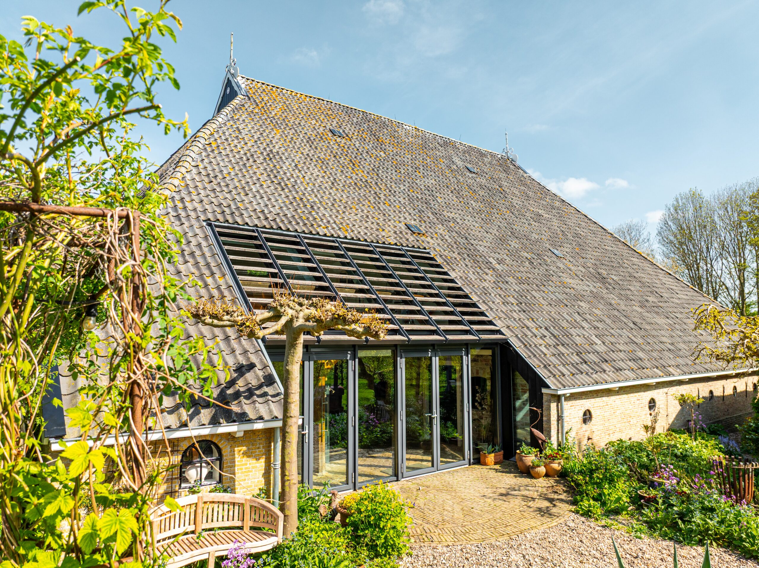 Wens van de opdrachtgever. In de prachtige woonboerderij in Schettens zat een te donkere keuken in de oude stal. Door een forse hap uit de kap te nemen, kon de rechte zijde hoger worden en kon dat deel van de kap voorzien worden van glas. De opdrachtgever wilde zowel boven als beneden meer licht krijgen door de glazen kap. Binnen is de keuken uitgebreid en om boven én onder licht te krijgen, is een deel van de bovenvloer uitgevoerd in beloopbaar glas. De opdrachtgever wilde ook een ruime toegang tot de tuin.