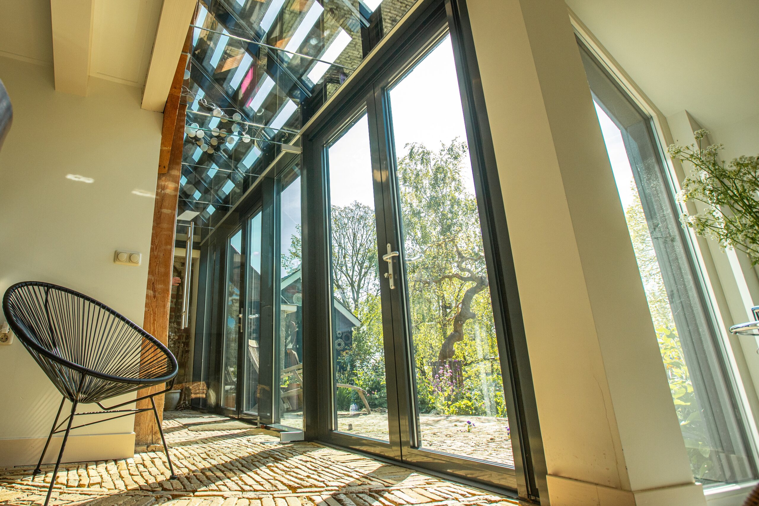 Onze bouwuitdaging. De grootste uitdaging was dat de daklijn door moest lopen: het nieuwe glazen dak mocht niet hoger zijn dan het bestaande pannendak. Op het glazen dak zitten lamellen en elk glas is geplaatst in gegalvaniseerde kozijnen. Elk ruit kan apart open, ook om ze te kunnen schoonmaken. De moeilijkheid van het in één lijn laten doorlopen is het waterdicht krijgen van het dak. Maar dat is uiteraard goed gelukt. We hebben gebruikgemaakt van red cedar en gegalvaniseerd ijzer, omdat beide materialen nog verkleuren en dan nog steeds goed bij elkaar moeten passen.